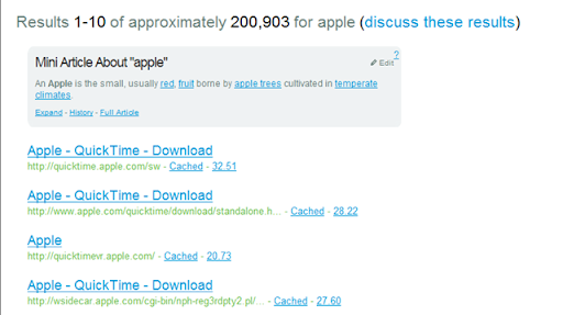 - Se pueden "discutir los resultados". Al igual que en las Wikis comunes y corrientes, acá hay una página de discusión para que podamos hacer nuestras críticas y sugerencias al orden en el que aparecen los resultados. Por ejemplo, en la página de discusión de la búsqueda "Apple" se critica que el primer resultado sea un enlace para descargar QuickTime. Estas páginas de discusiones se pueden agregar a una "Watch-list" para saber cuando alguien a agregado algún comentario.