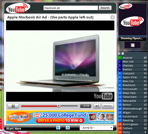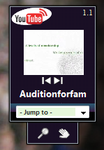 En su forma compacta, muestra un slideshow con miniaturas de videos elegidos con un criterio desconocido, podemos avanzar y retroceder entre los videos, o elegir uno de los de "la lista de criterio desconocido" al hacer clic en "Jump to", pero es bastante difícil que así encontremos lo que buscamos. El gadget se vuelve práctico cuando hacemos click en la lupa de "Buscar", aparecerá un Flyout en el que podemos ingresar las palabras clave, navegar por los resultados y reproducirlos.