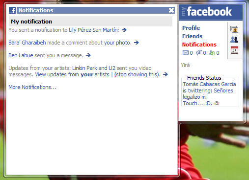Igual de práctico que los anteriores pero no tan fácil de configurar. Mientras que en los gadgets de Twitter y Last.fm bastaba con poner tu nombre de usuario y tu contraseña, este gadget te obliga a generar un "código único de seguridad", te manda a la página de Facebook, le das la autorización, luego debes copiar los feeds de las notificaciones, y también el feed del estado de tus amigos,
