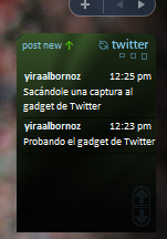 Si estas enviciado con el servicio de microblogging del pajarito, este gadget te será bastante útil. Al igual que el de Last.fm es muy sencillo y fácil de usar. Cómo es evidente, debes configurarlo ingresando tu nombre de usuario y tu contraseña. Para escribir un nuevo post debes hacer click en "post new", aparecerá un sencillo "flyout" para escribir lo que estés haciendo. Y como diría el Capitán Obvio, para actualizar la lista de posts debes hacer click en el botón de actualizar.
