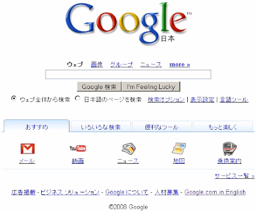 Pero ahora parece que Google quiere volver al pasado, o al menos hacer que página principal deje ser tan "casta y pura" como viene siendo hasta ahora. Hace unos días Google Korea ya aplicó algunos cambios a su homepage, agregando una barra de vínculos a sus servicios más importantes. Y ahora Google Japón hace lo mismo, con la diferencia de que además ha clasificado a los servicios en pestañas (tal como se ve en la imagen de arriba). No se sabe si Google aplicará estos cambios en la interfaz en otros países.